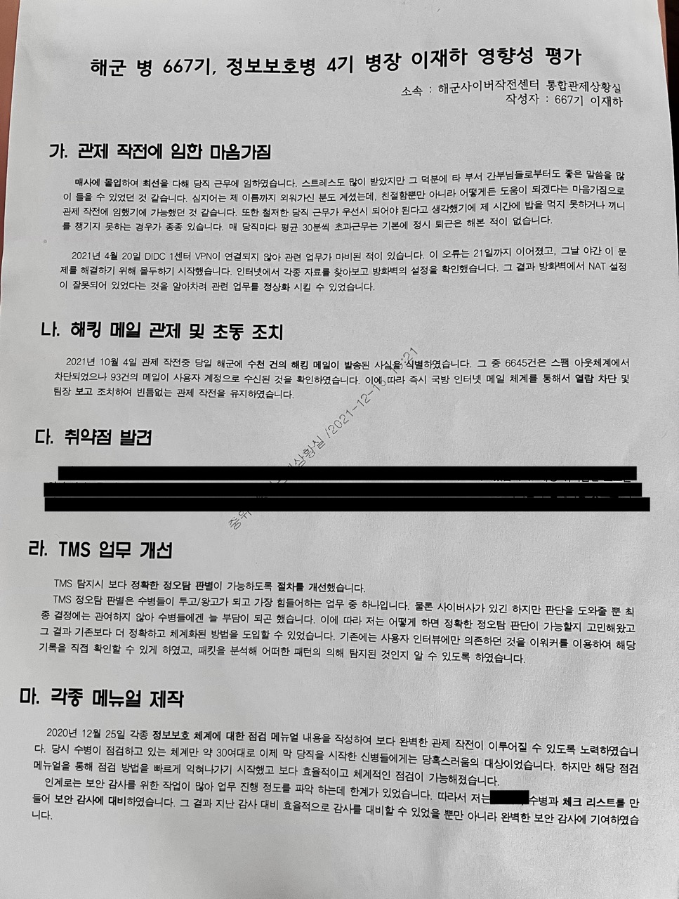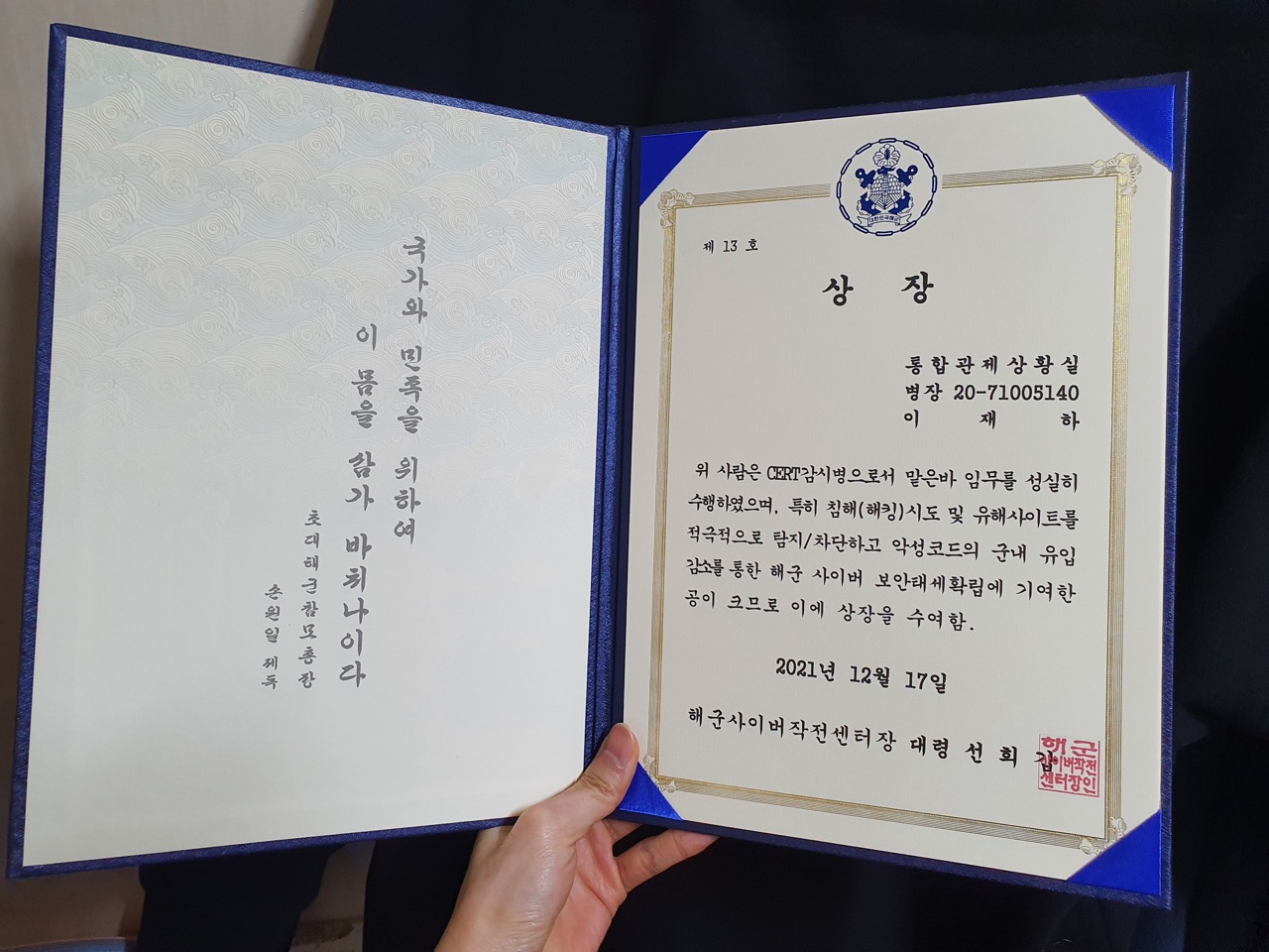 정보보호병으로 입대하면서 해군 사이버작전센터에서 근무할 수 있었고, 계룡대 해군 합동 생활관에서 생활을 했다.
