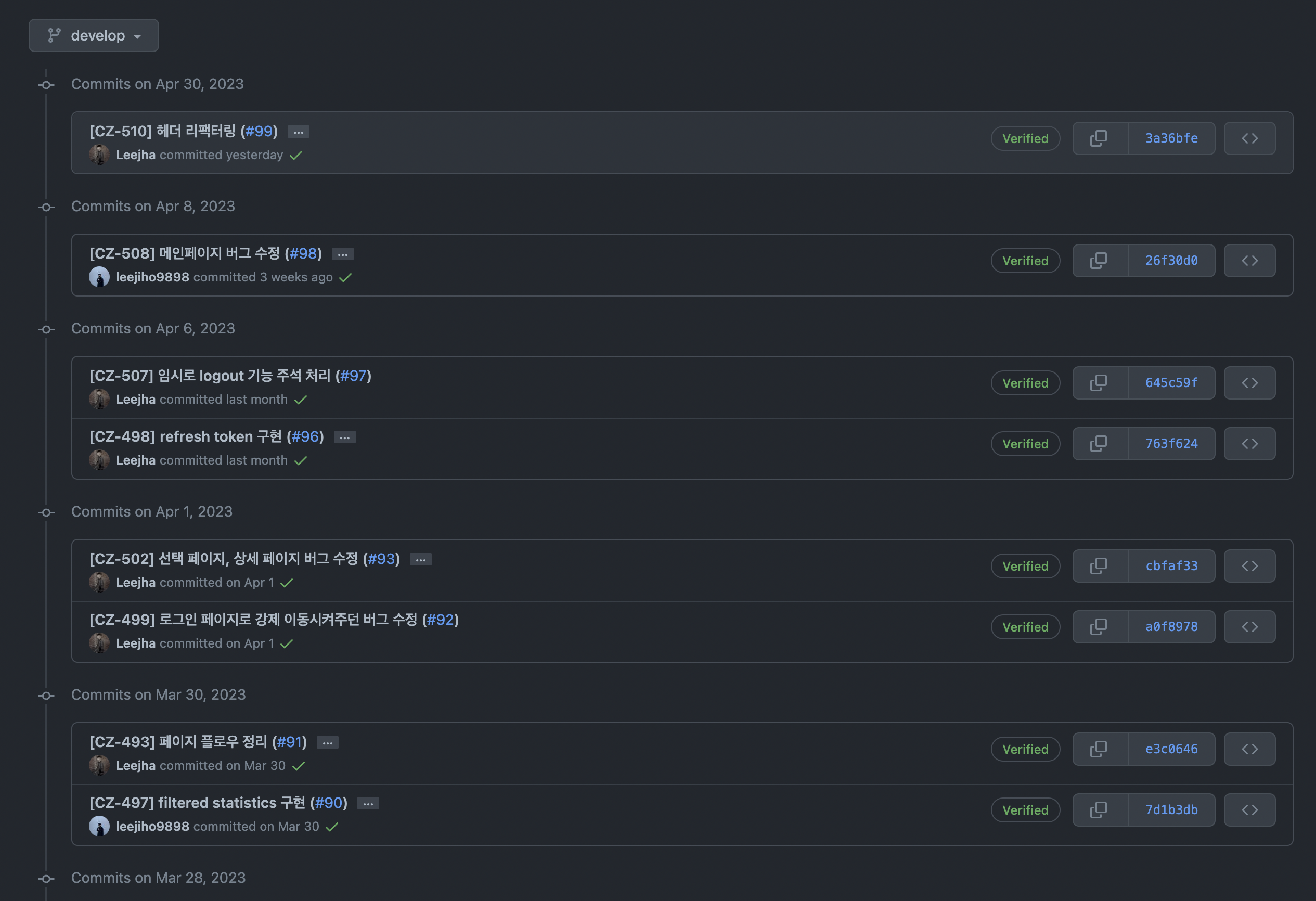 수정 사항을 커밋 히스토리 변경 없이 합치고자하여 develop 브랜치에서 rebase 했다.