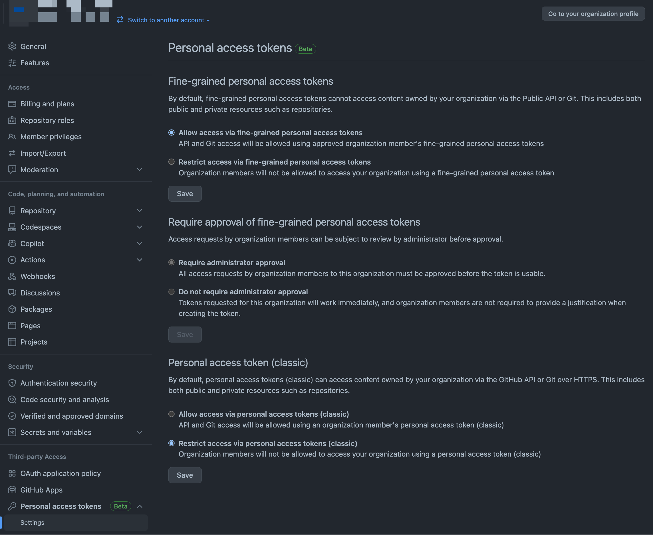 Organization owners can control whether to allow fine-grained personal access tokens and personal access tokens (classic), and can require approval for fine-grained personal access tokens.