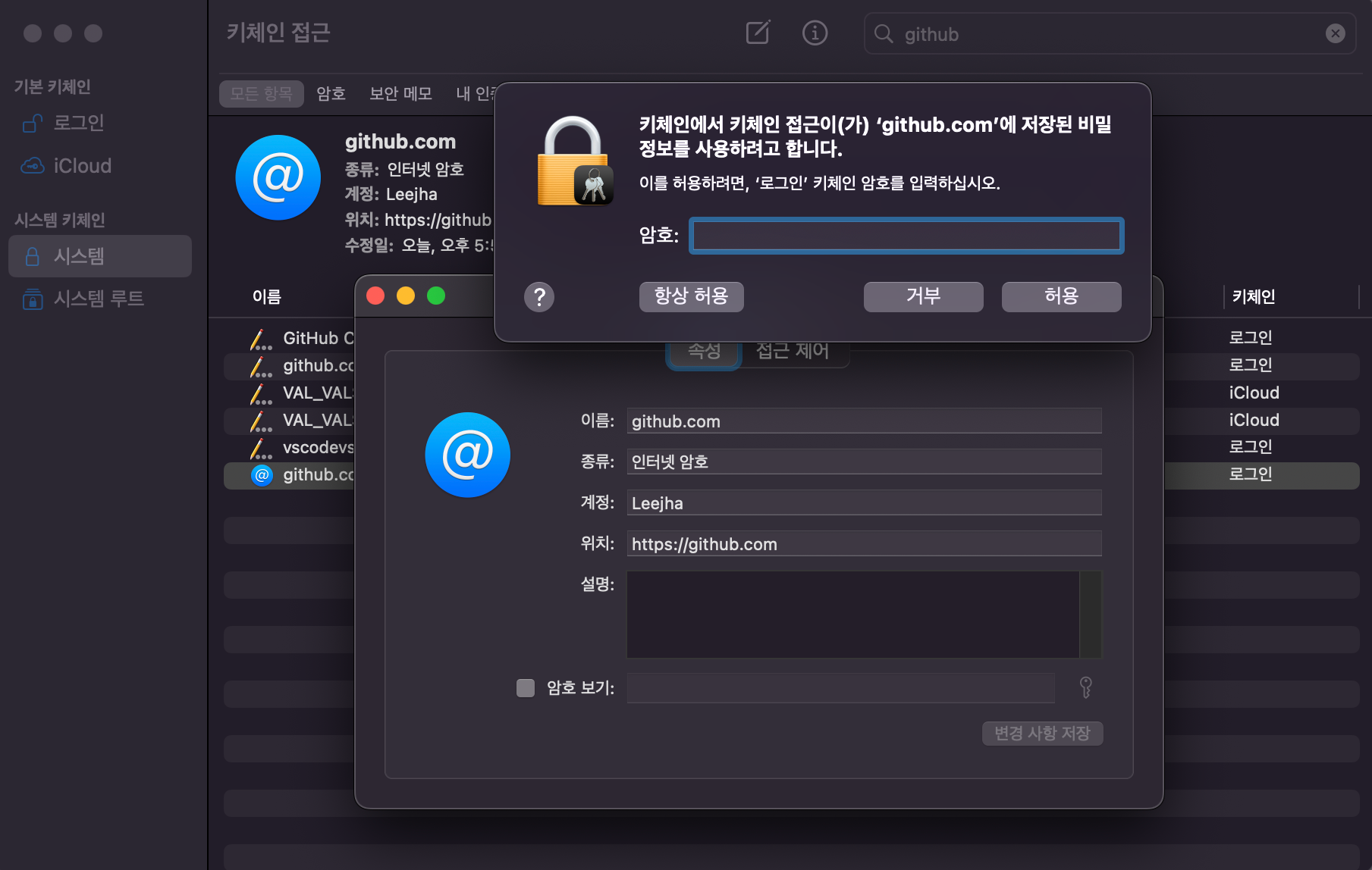 키체인 접근에서 github.com을 찾아 암호에 넣어준다.