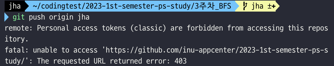 올가니제이션에서 다시 personal access tokens (classic)으로도 접근할 수 있도록 요청하고,