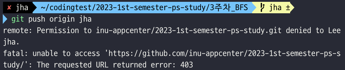 해당 레포지토리에 권한이 없다는 새로운 에러 메시지가 나타났다.