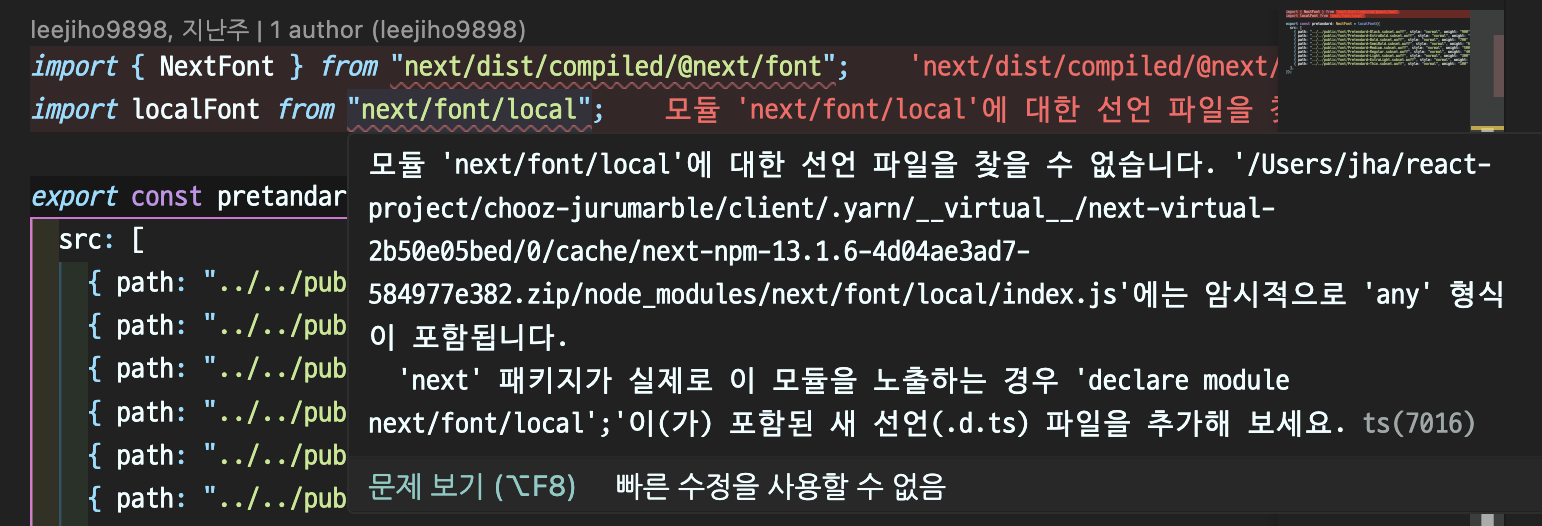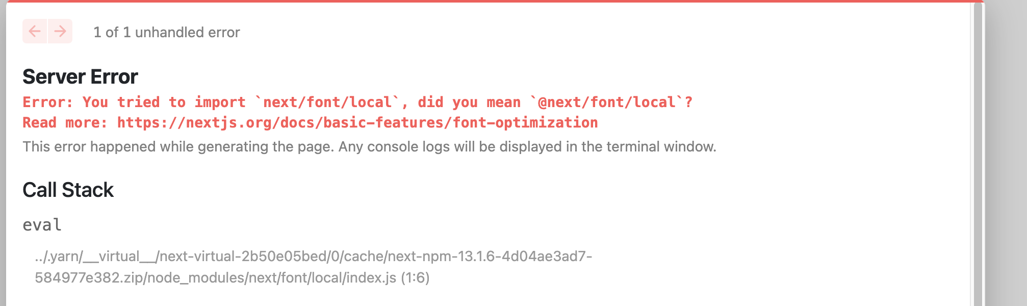 그리고 위에서 style-loader과 css-loader을 새 워크스페이스(next 13.4.12 버전)에 넣었는데 오히려 이것이 에러를 발생시켰다. (next/font/local을 인식할 수 없었다.)