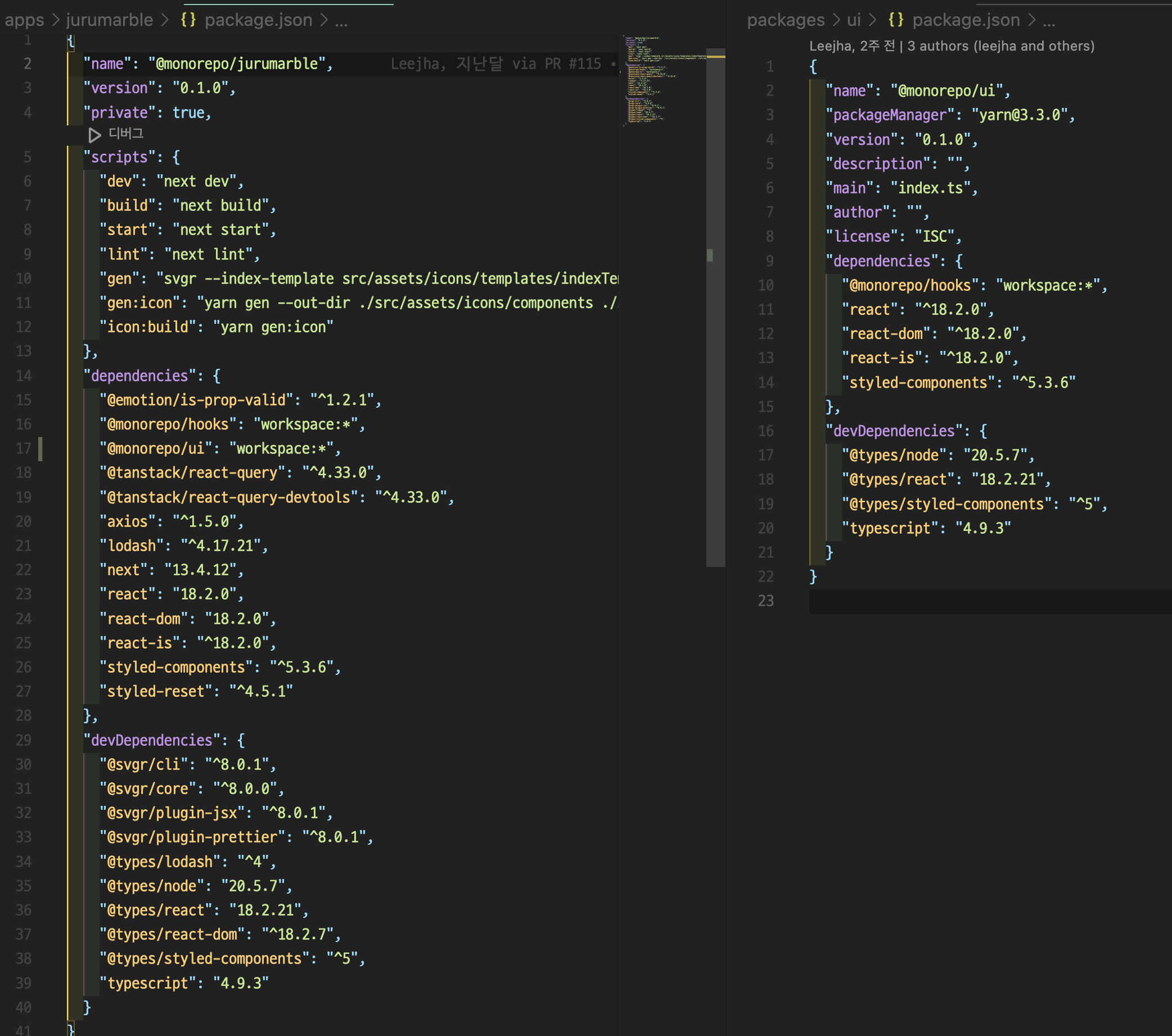 기존 작업 사항을 붙여 넣고, package.json에서 디펜던시 버전을 타 워크 스페이스와 일치시켰다.