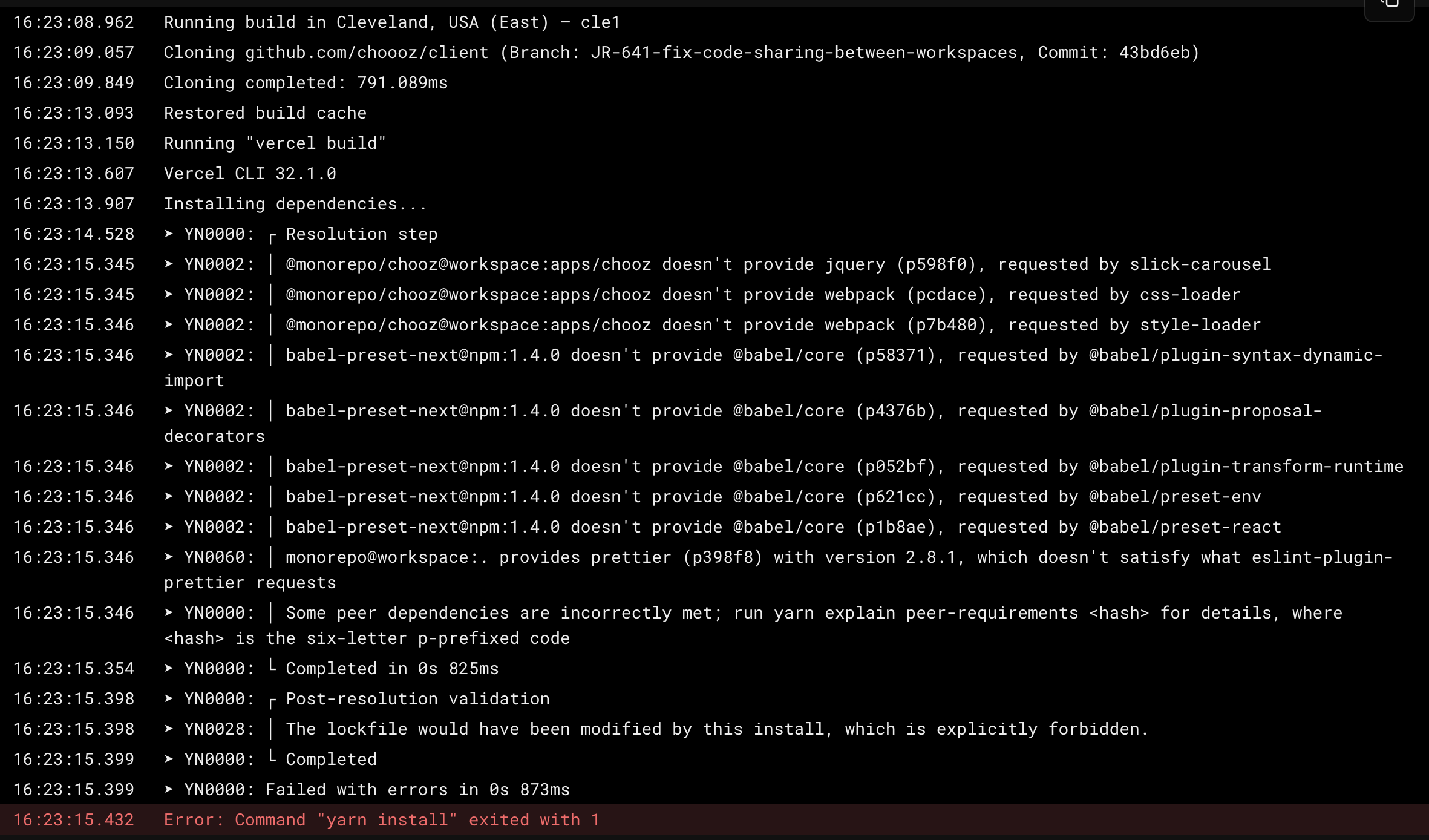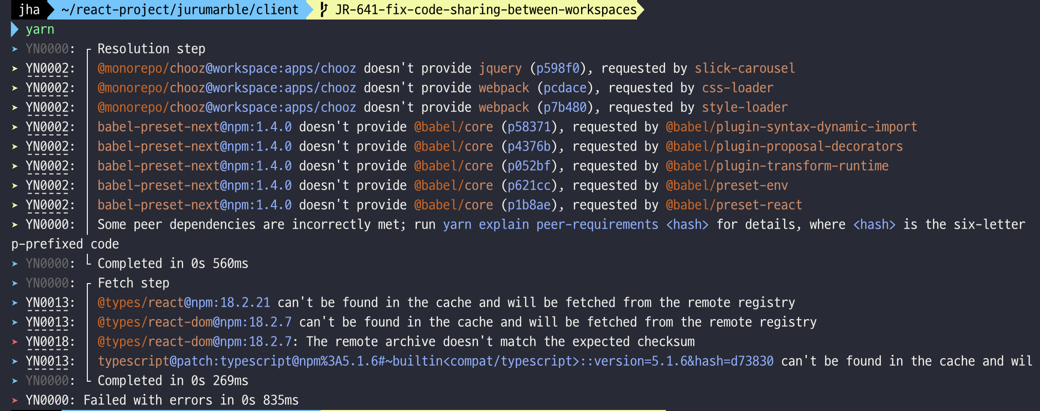 로컬에서 해당 에러를 재현해 보기 위해 yarn install을 시도해 보았다.