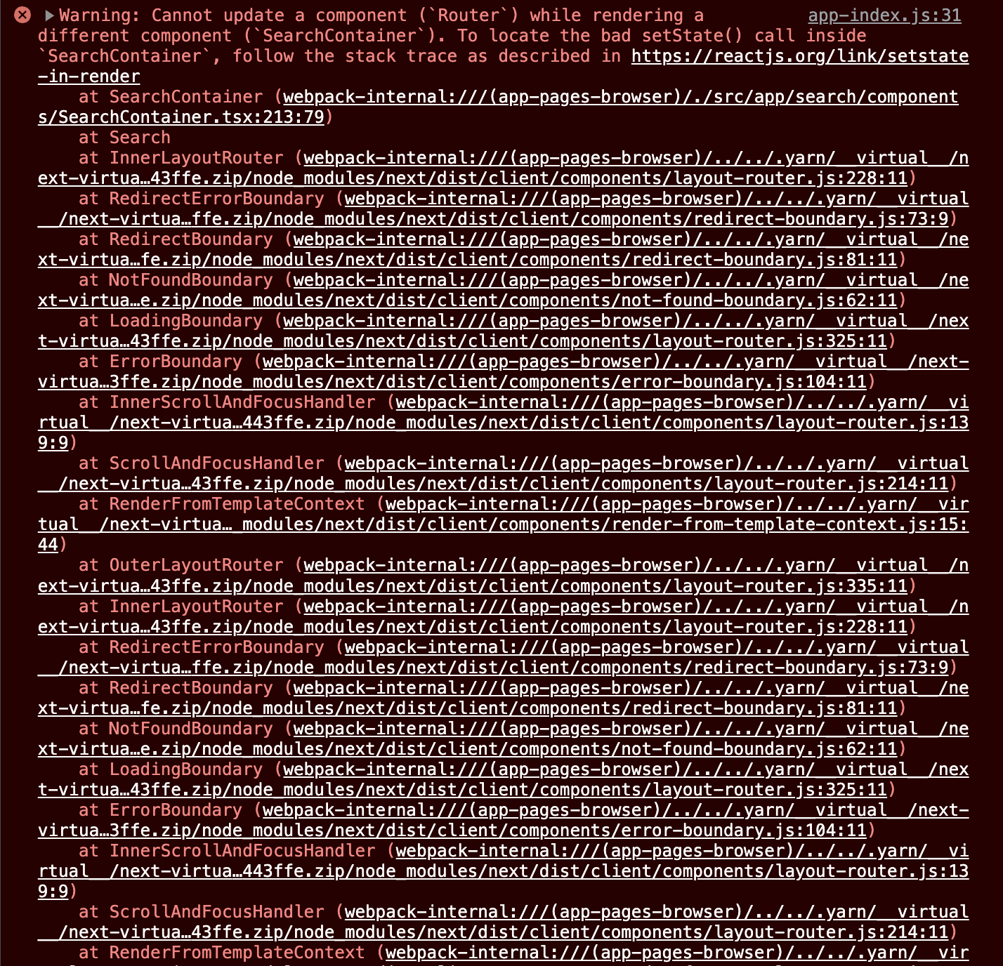 Warning: Cannot update a component (`Router`) while rendering a different component (`SearchContainer`). To locate the bad setState() call inside `SearchContainer`, follow the stack trace as described in