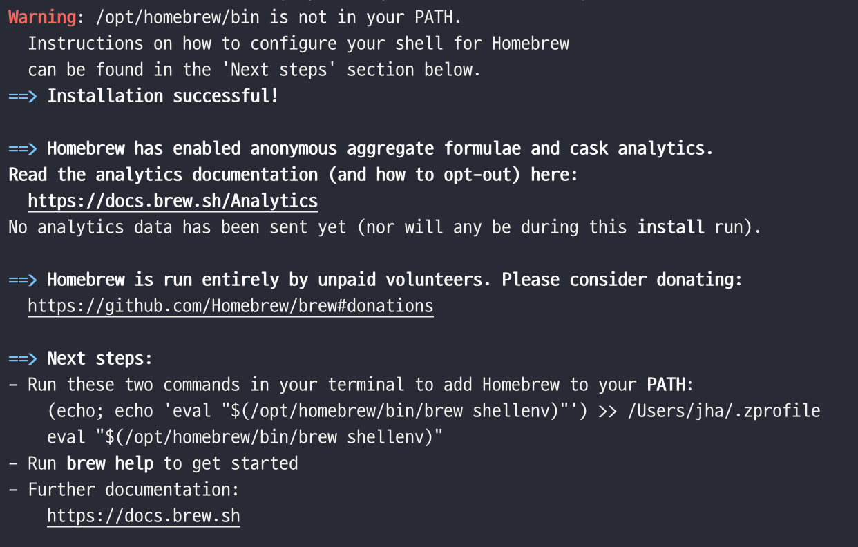 /opt/homebrew/bin가 경로에 없어, Next steps을 수행해야 한다고 한다.
