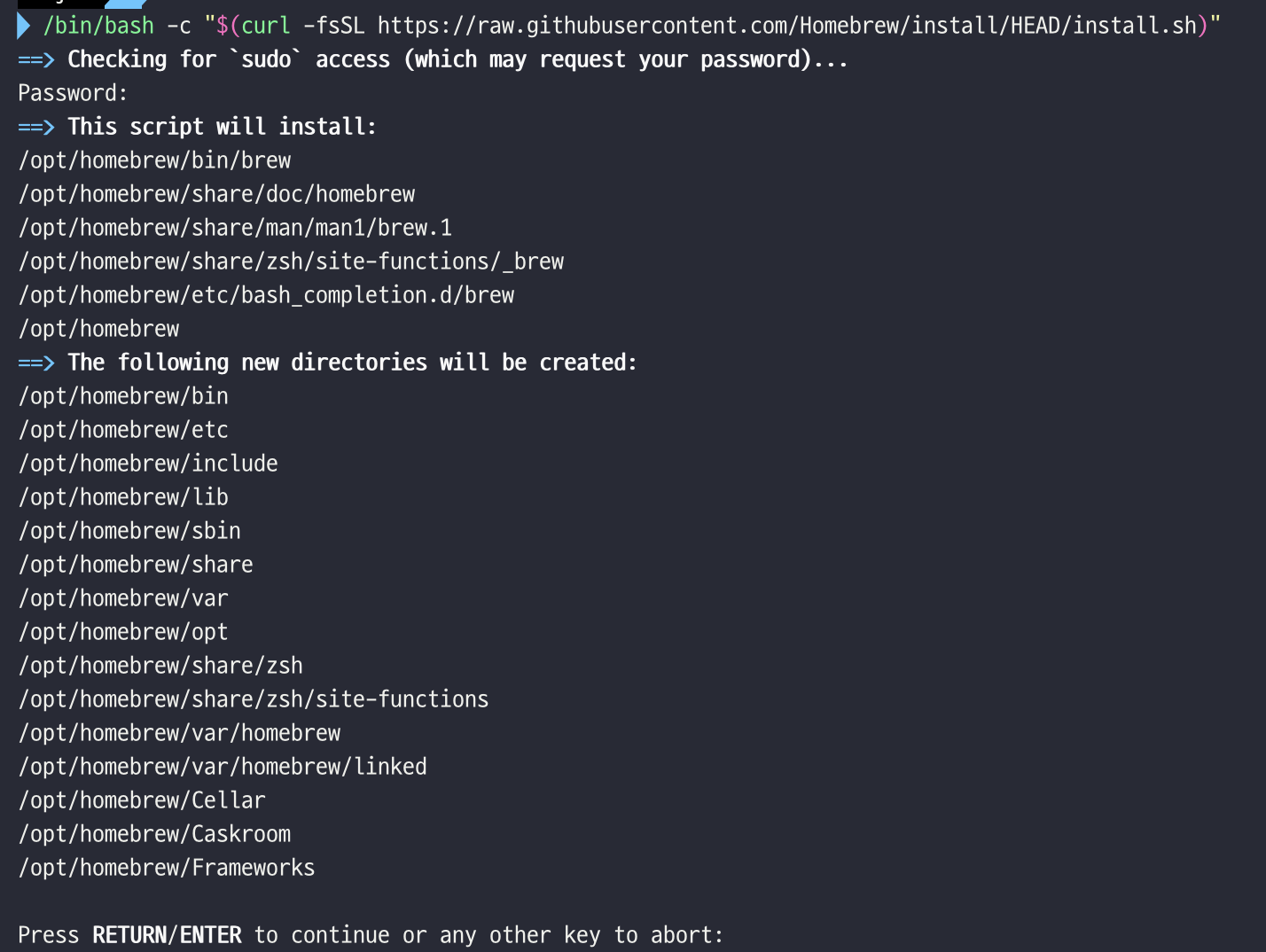 계속 진행하면 homebrew가 /opt/homebrew/ 디렉터리에 설치된다.