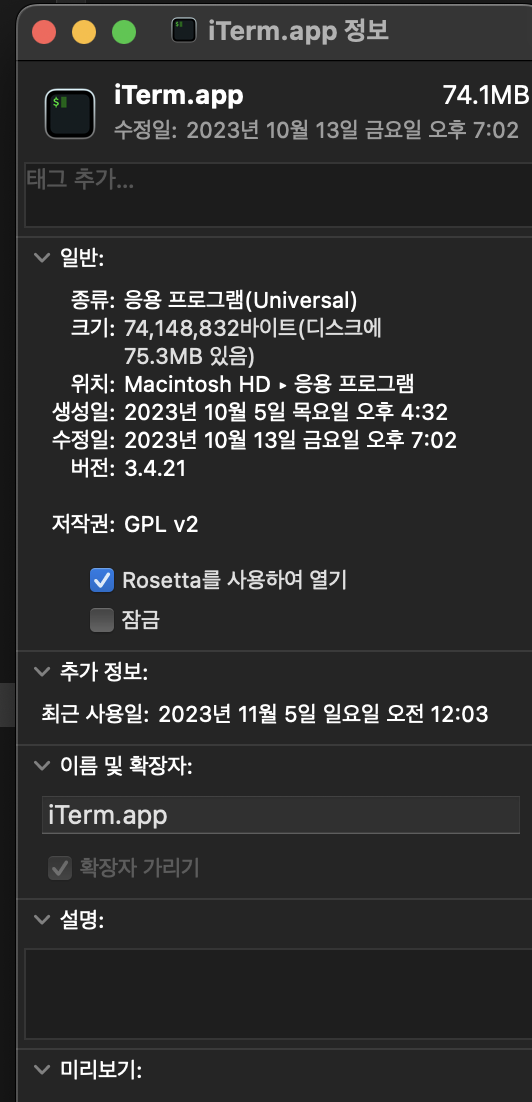 응용프로그램 목록에서 iTerm.app에 대한 정보 가져오기를 클릭하면 아래와 같은 창이 나타난다.