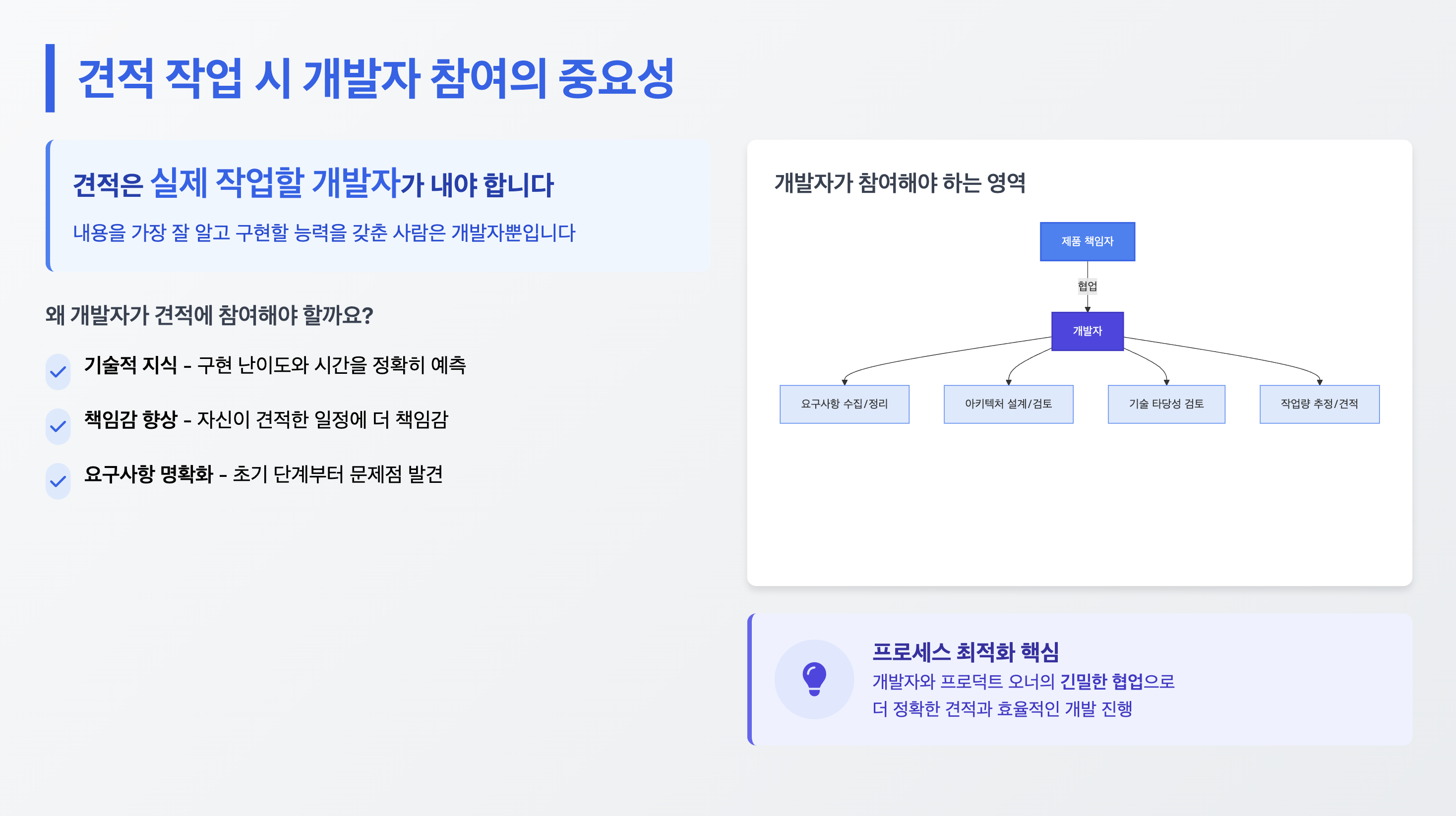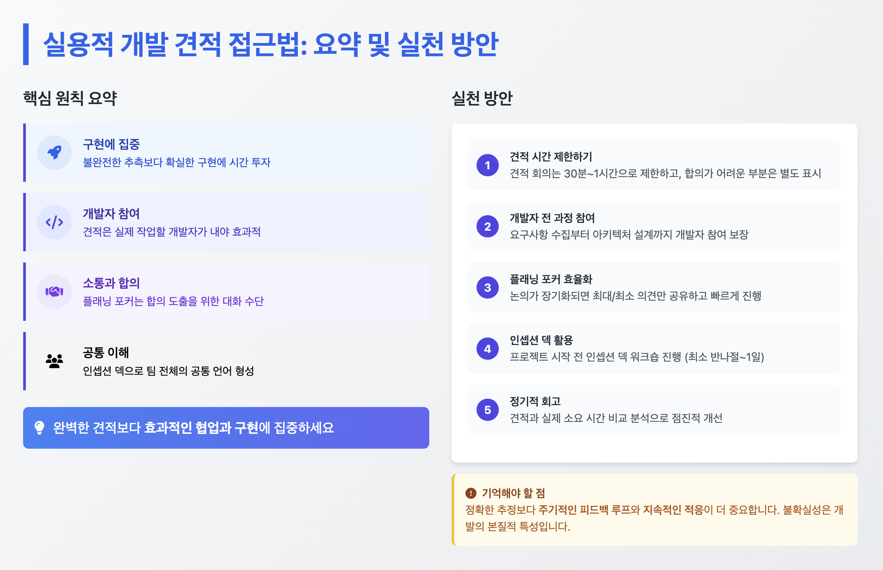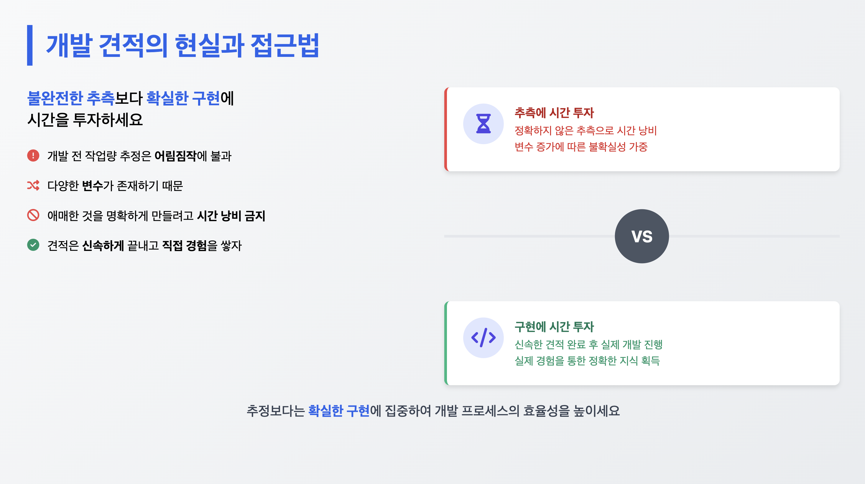 - 견적은 가능한 신속하게 끝내고 구현할 시간 더 확보하는 게 더 좋을 것