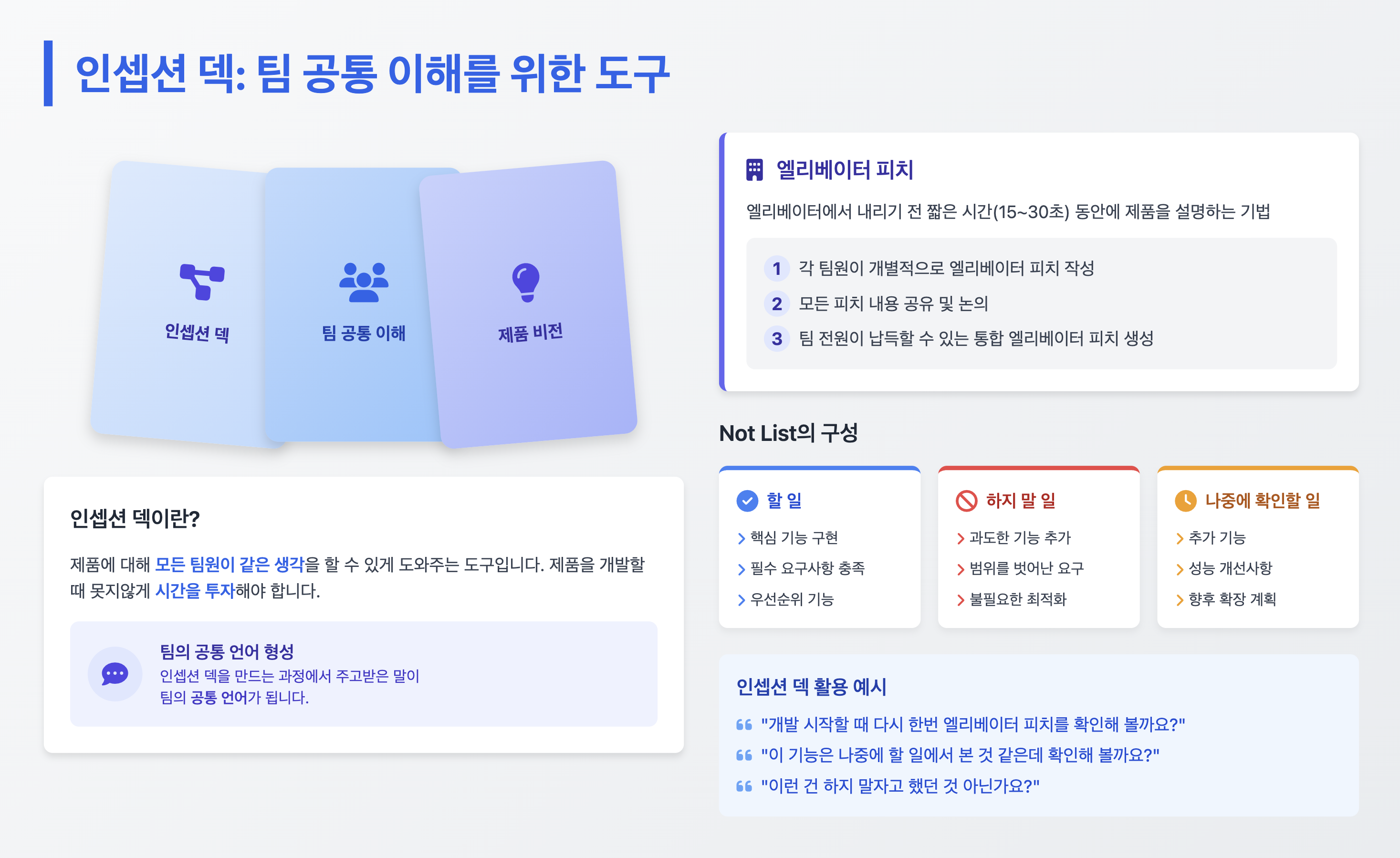 - 인셉션 덱을 만들면서 주고받은 말이 팀의 공통 언어가 됨