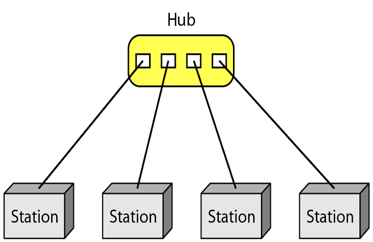 - 각 장치는 직접적인 통신이 불가하고 허브를 통해서 통신