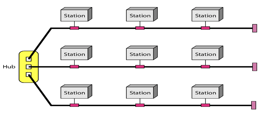 - 허브(hub)라는 중앙제어장치(central controller)와 전용 점 대 점 링크 연결