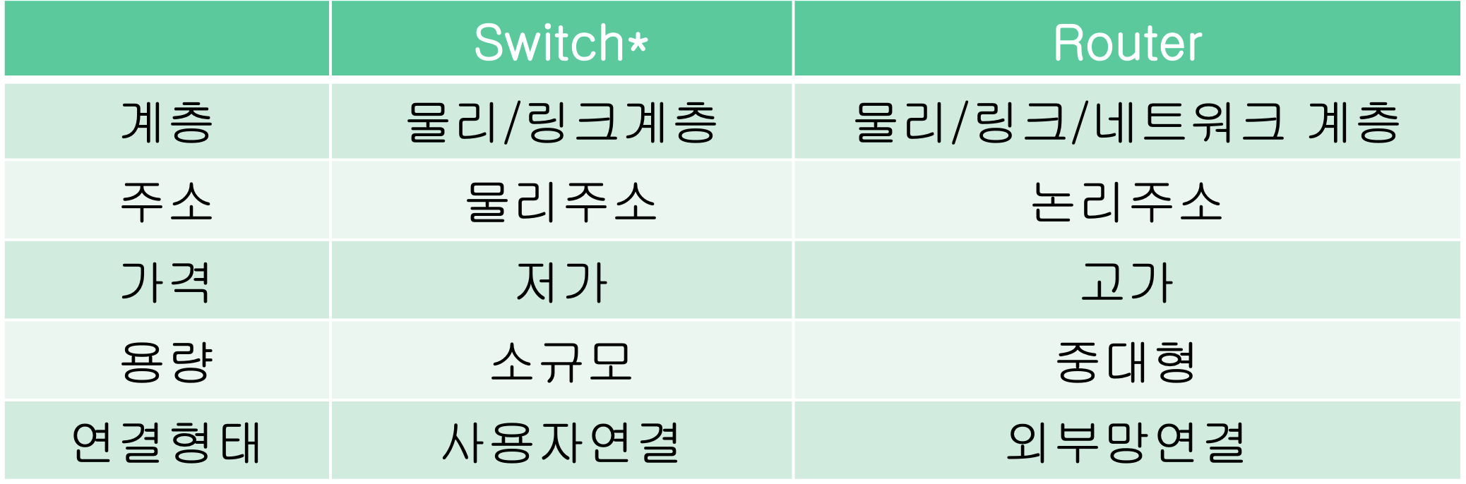 - 스위치 : 맥주소를 보고 해당 출력 포트로 내보냄