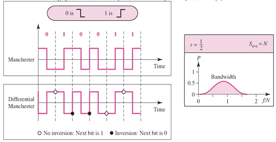- 맨체스터 : 각 비트 간격 중간에서 신호를 반전시킨 신호를 데이터로 사용