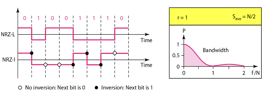 - NRZ-I(Non Return to Zero - Invert) : 다음 데이터(비트)값이 1이 될 때 마다 음에서 양으로, 양에서 음으로 값을 바꿈