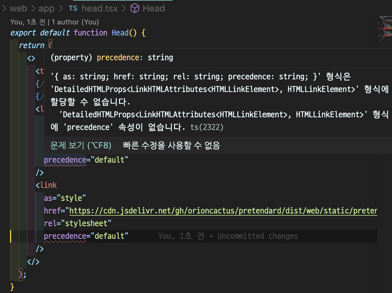app/head.tsx에 해당 폰트의 <link> 코드를 넣었지만 위와 같은 에러가 발생했다.