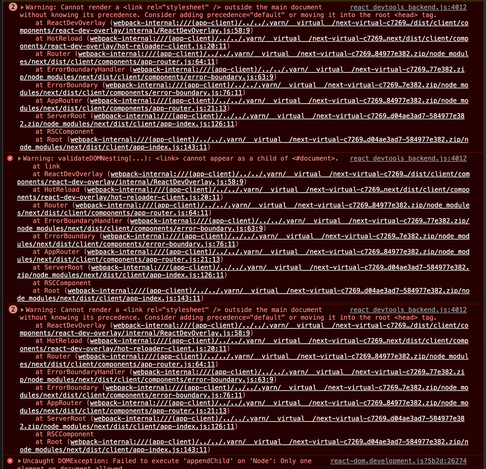 이에 head.js에 대한 공식문서를 읽어보았고, head.js에 <link rel="stylesheet" />을 사용할 경우 precedence 속성이 필수적이라는 것을 알았다. (https://beta.nextjs.org/docs/api-reference/file-conventions/head#supported-head-tags)