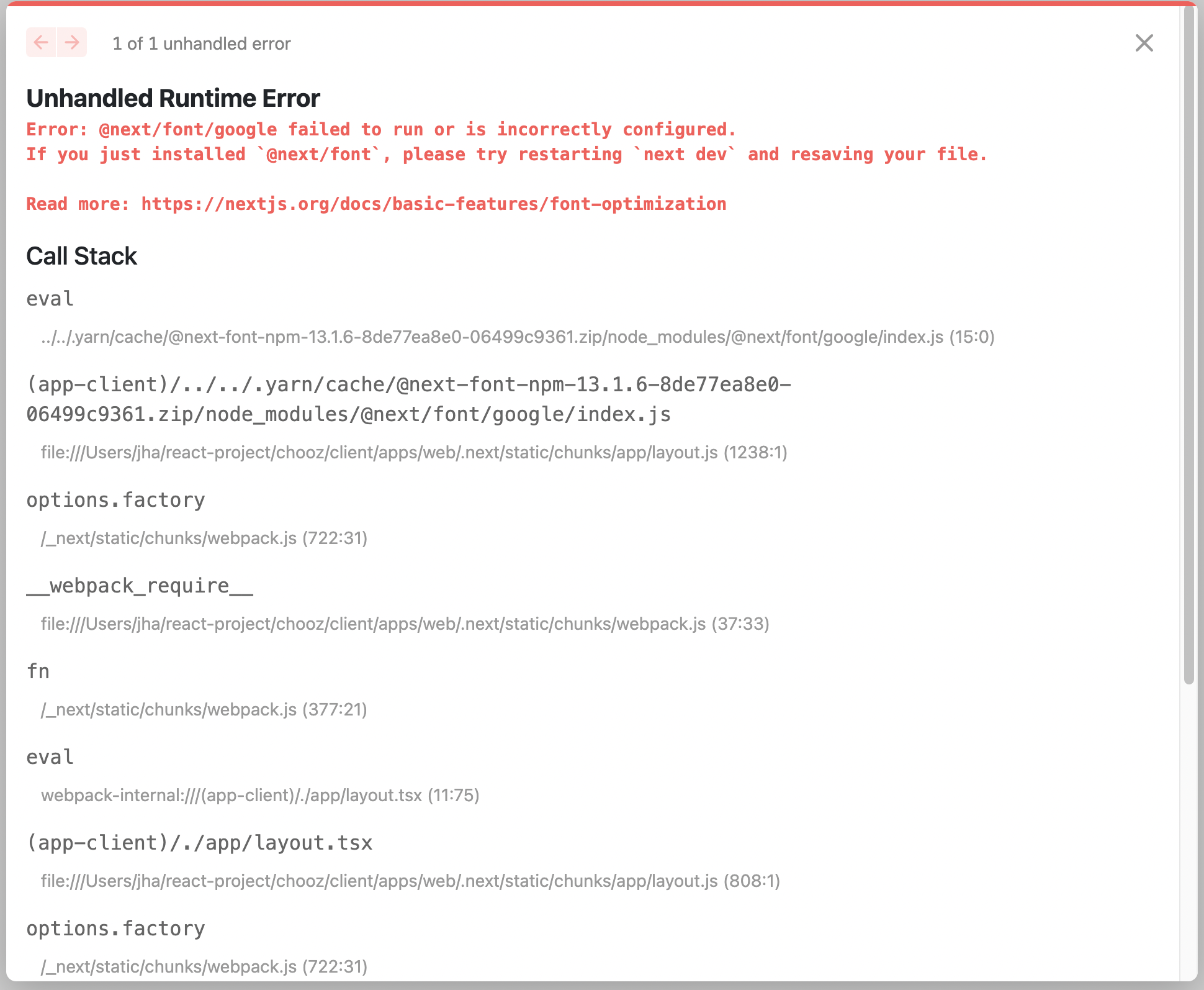해결 방법으로 라이브러리 삭제후 재설치, next.js 최신 버전으로 업데이트, 구글링, next.js 깃허브 이슈 확인 등 할 수 있는 건 다 해봤지만 자료도 부족하고 도저히 해결할 수가 없었다.